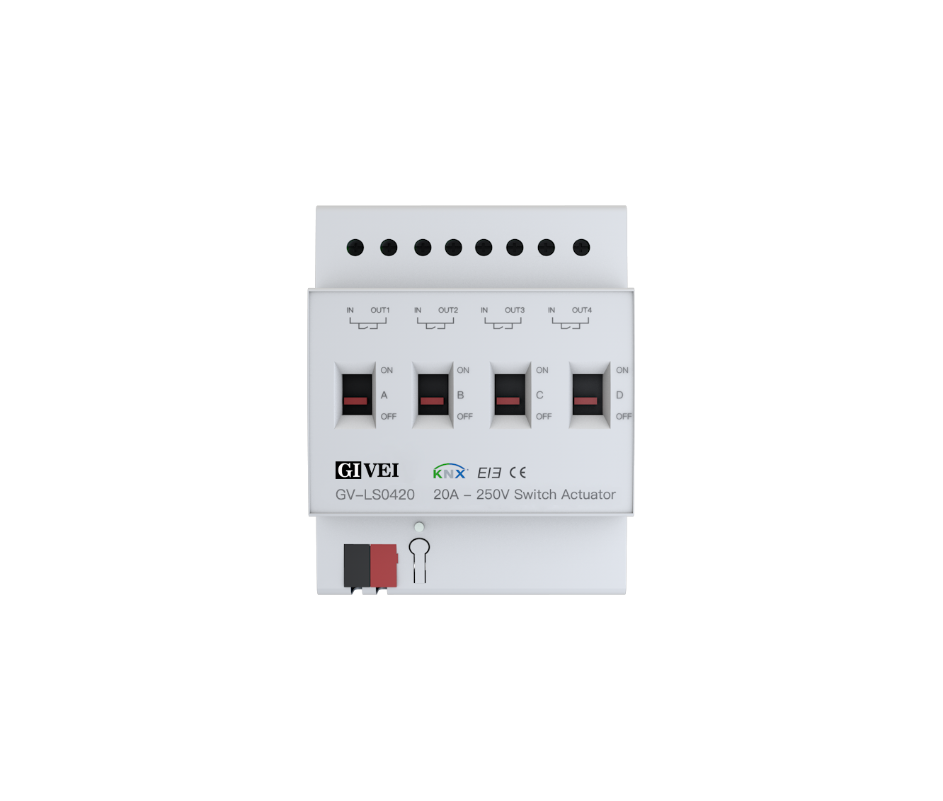 4路16A开关执行模块是模块化的安装设备,有4路输出。通过EIB总线接线端子连接到 EIB / KNX 系统,使用工程设计工具软件ETS软件(版本 ETS4.0以上),进行物理地址的分配以及参数的设定。 每个强切开关执行器输出的最大负载电流为16A,含4路智能继电器,每回路可独立控制3300W灯具的开关,继电器带手动开关,具有磁保持功能。